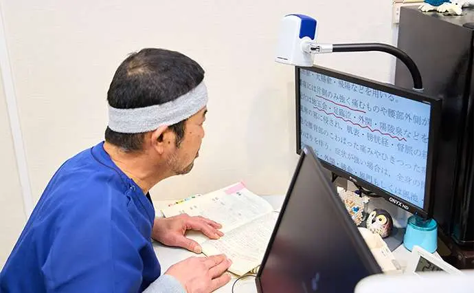 準備を進める中で、不慣れなパソコンでの事務作業にも取り組みました。視覚の特性もあり、拡大表示で資料を見比べながら物品の性能を調べ、見積もりを取り、必要なものを一つずつ揃えていきました。施術を始める前には、職員の方に協力してもらい、試行運用を重ねる日々でした。