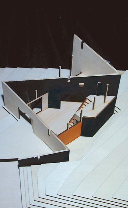 その発想は、六角が修士課程のときに設計した『ORU 折織居』という名の住宅ですでに具現化されている。山中に建つこの六角の処女作ともいえる家はその名の通り、あたかもたった1 枚の紙を“折る” ようにしてすべての壁ができあがっている。